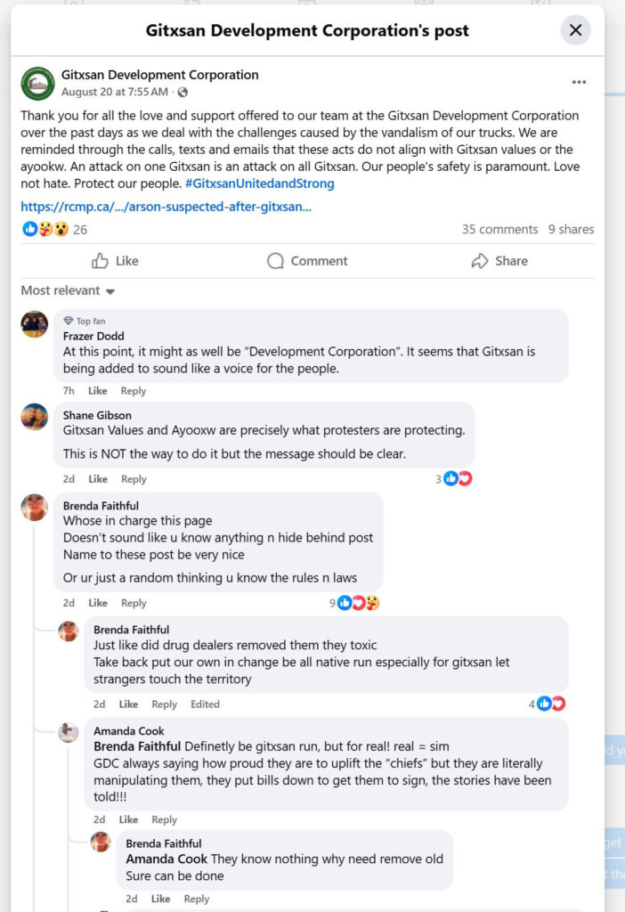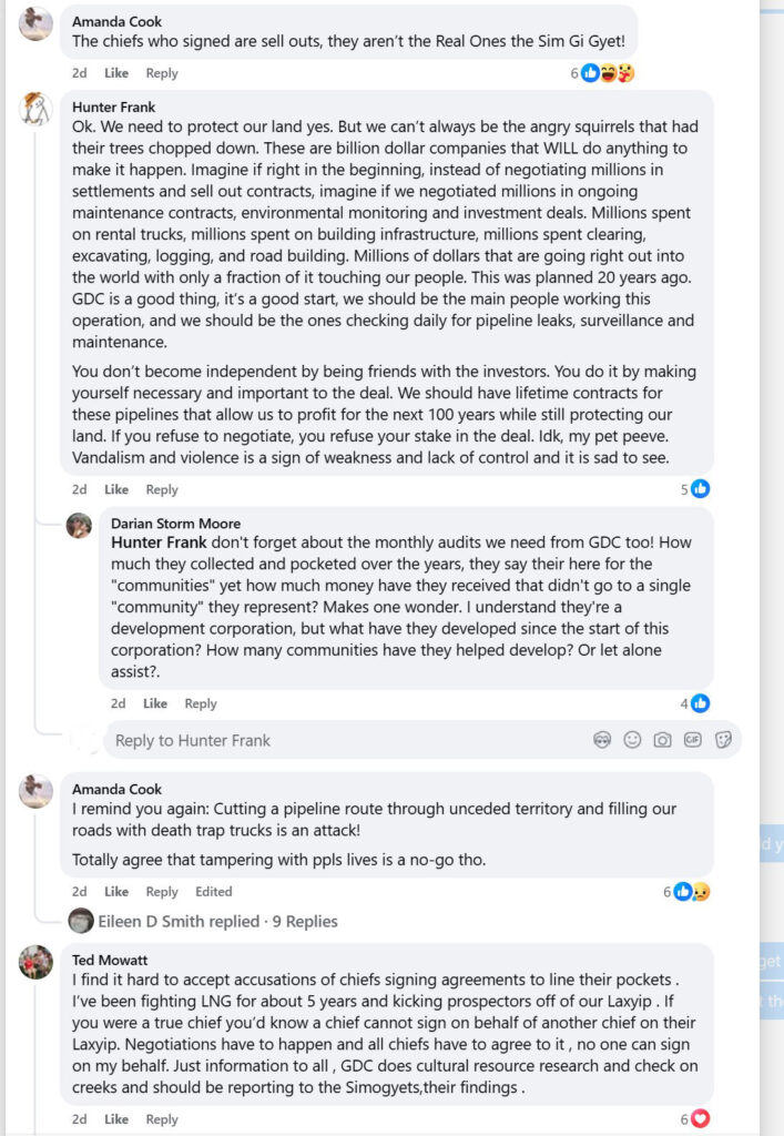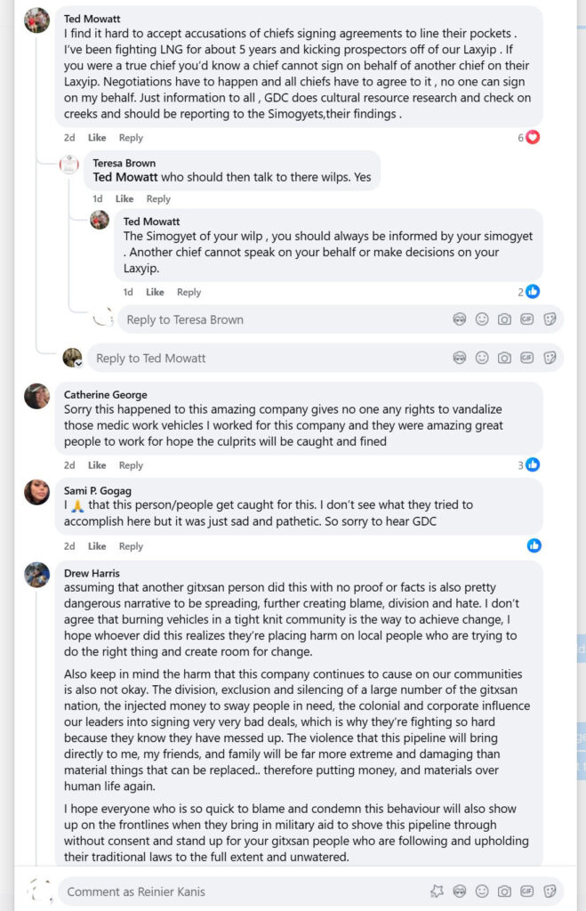 Most Gitxsan support the project, and the funding it will provide to the nation. Yet we have one group of vandals who think they are more important, than the democratic rights of others. As they say, talk is cheap, and the evidence needed to convict is missing. And we all heard the protesters say there is no evidence, so stop with the accusations, really a lack of evidence is proof of innocence?