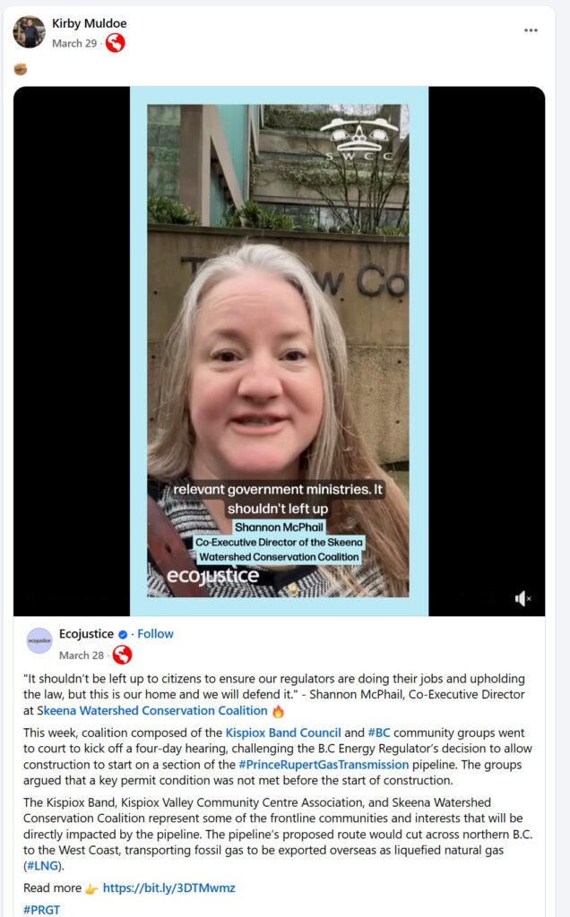 In fairness we also cannot rule of supporters Skeena Watershed Conservation Coalition or the Kispiox Valley Community Centre Association (KCCA) or the Kispiox Band Council, they are all part of a local anti industry group and get funded by The American Tides Foundation, aka the MakeWay Foundation and the Gordon and Betty Moore Foundation to name a few. If you wonder why I named those there groups, its clear the collaborate as they did below in an attempted lawsuit designed to block the PRGT pipeline. It would be fair comment to suggest that these three organizations collaborate in their efforts to block the PRGT Pipeline. Many of the members are also members of the other groups, as if having multiple organizations makes their voices stronger.