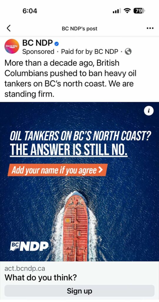 David Eby and the NDP are up against the truth, BC supports getting rid of the tanker ban, it supports a pipeline from Alberta, but Eby is committed to shutting down oil and gas, so he is paying for commercials on social media because of public opinion is in favor of shipping oil and gas off the coast of British Columbia. Even today we still allow Americans to freely manipulate decision making here in Canada. We need to end foreign interference in Canada if we are going to survive as a nation, or we can follow the BC NDP and let first Nations tell us how to conduct our affairs.