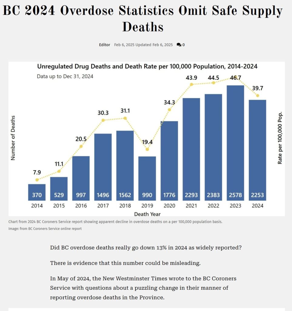When the NDP came to power in 2017, they initially supported expanding harm reduction measures, including safe supply, to address the opioid crisis. Keep that date in mind and look at the next fact “The city’s first tent city is thought to have been established in 2007 at 950 Main Street.” In 2009, the BC Supreme Court ruling in Victoria (City) v. Adams was a landmark decision that reshaped how municipalities in British Columbia, and across Canada, handle homelessness and public space. Now back to this story “They introduced prescribed safe supply programs in 2020, allowing users to receive prescribed opioids as an alternative to illicit street drugs with the goals of stopping people’s purchase of street fentanyl and reducing fatal overdoses. Four years later, there is no scientific proof the program has achieved either.”