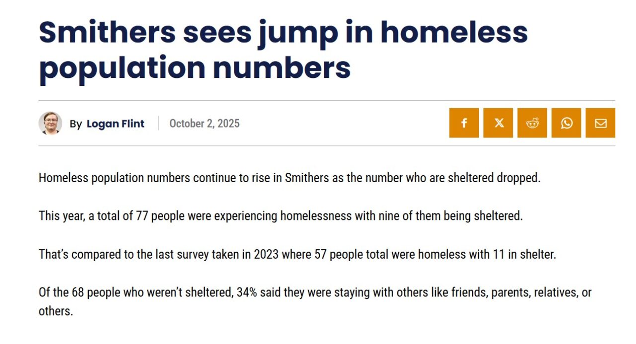 In spite of all the new buildings in Smithers dedicated to low income, homeless, women shelters, person with severe disabilities, the number of homeless in Smithers keeps growing, equally so is the absence of counting how many are suffering from chronic addictions, and or died from these addictions. Why? Because there is an intentional attempt to mislead the public into supporting people who actually are only  and genuinely homeless, and intentionally hiding the number of addicts driven out of their real homes due to addiction.