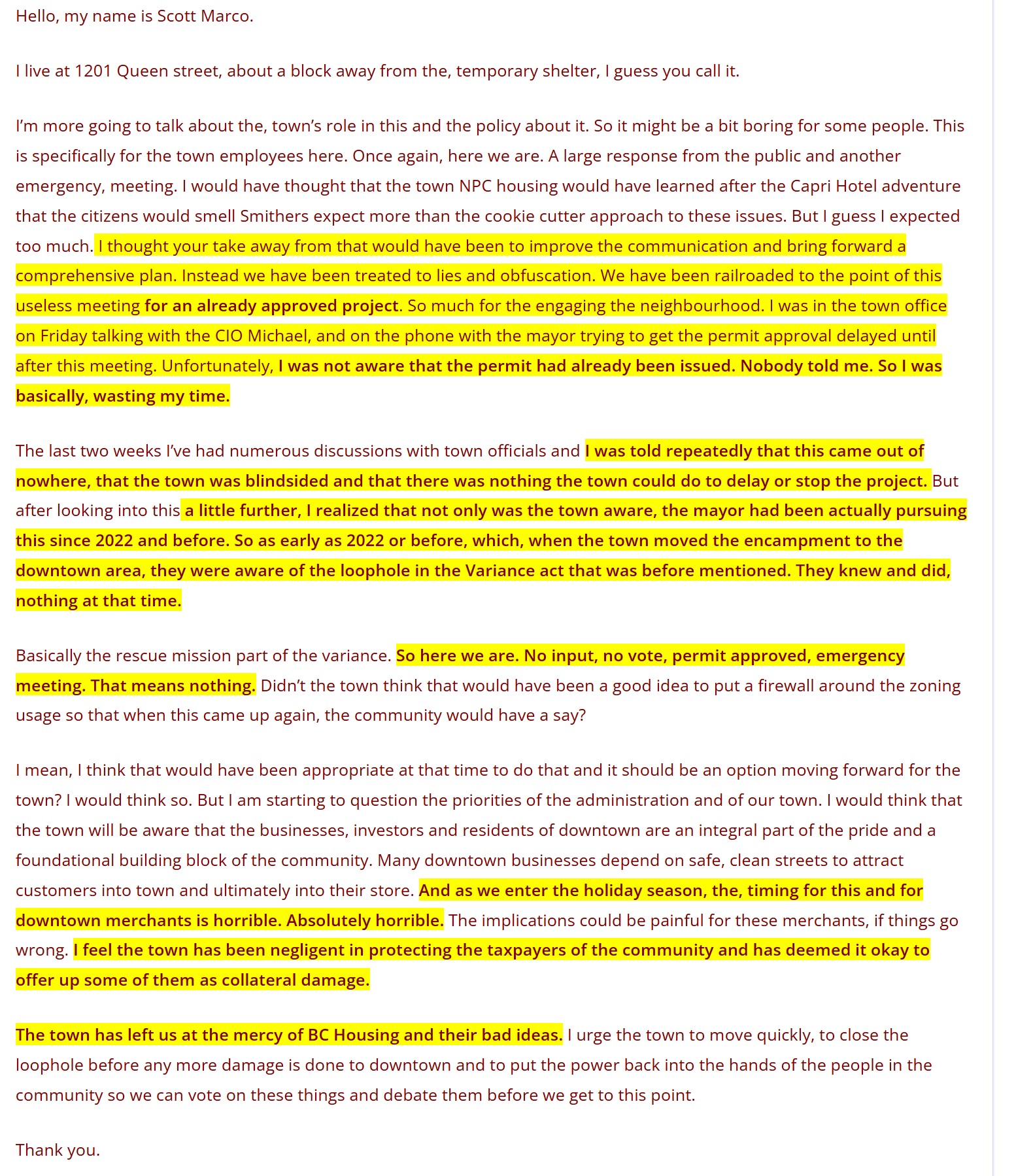 Clearly the town of Smithers did learn from experience that being open with the public would result in a backlash as it did in the case of the  Capri Motor Inn. The key component is Smithers residents do not want to be punished by way of consequence, for the BC NDP refusing to deal with, or even acknowledge the actual underlying problem. The BC NDP refuses to treat drug addicts or chronic alcoholics, so we become the victims of consequence, while they (the NDP) sell us fake compassion for these addicts in order to uphold their addictions policies.