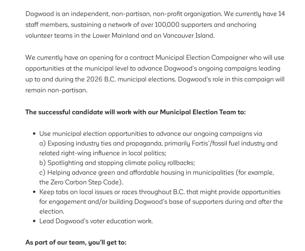 The candidate’s job is to coordinate with their choices of who should run our town and city councils, as is stark contrast with voters deciding that choice. Dogwood BC Intends to use American funding, to manipulate our munic0ple elects,