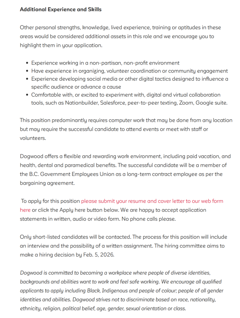 - Elections BC Review: Elections BC, the province’s independent election watchdog, also reviewed Dogwood’s activities to ensure that, as a third party, it did not make an indirect political contribution to a leadership contestant.
