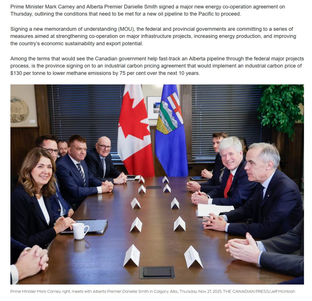 Carney signs major energy agreement with Alberta, laying out conditions for new oil pipeline (added 11/27/25)