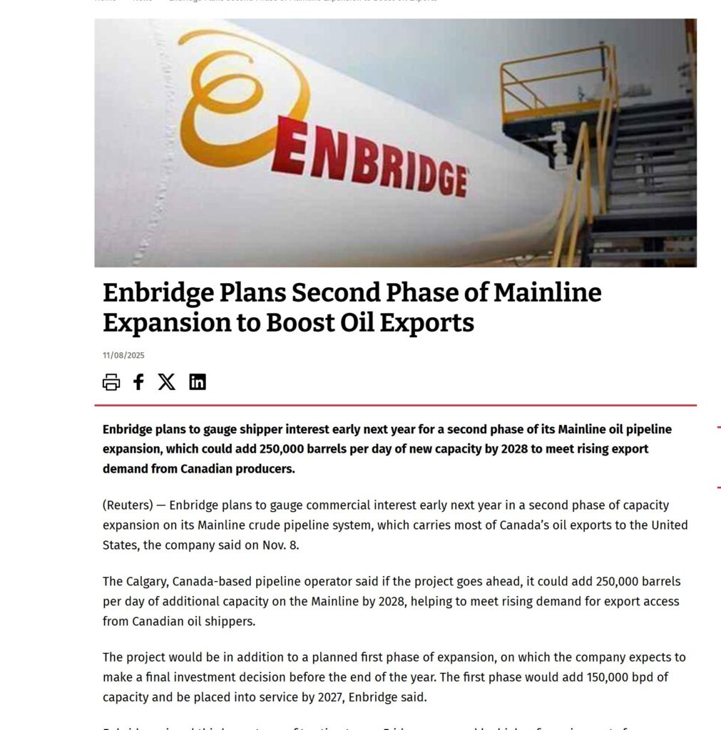 Read the Full Story Here (added 11/10/25)Enbridge Plans Second Phase of Mainline Expansion to Boost Oil Exports