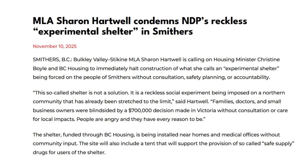 Read the Full Story Here (added 11/10/25)MLA Sharon Hartwell condemns NDP’s reckless “experimental shelter” in Smithers